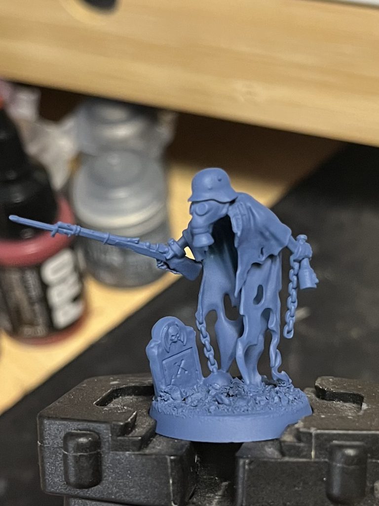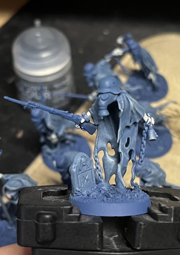 things floating across no man's land with real, old and worn, equipment. So starting off I sprayed them with Wolfkin Grey cause I had that laying around, it's a colour match to Games Workshop's The Fang colour, and it worked great. Just look at that great start.