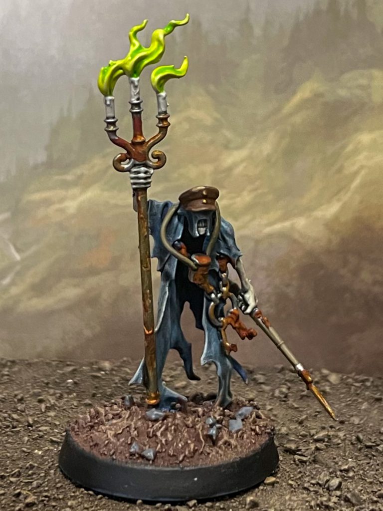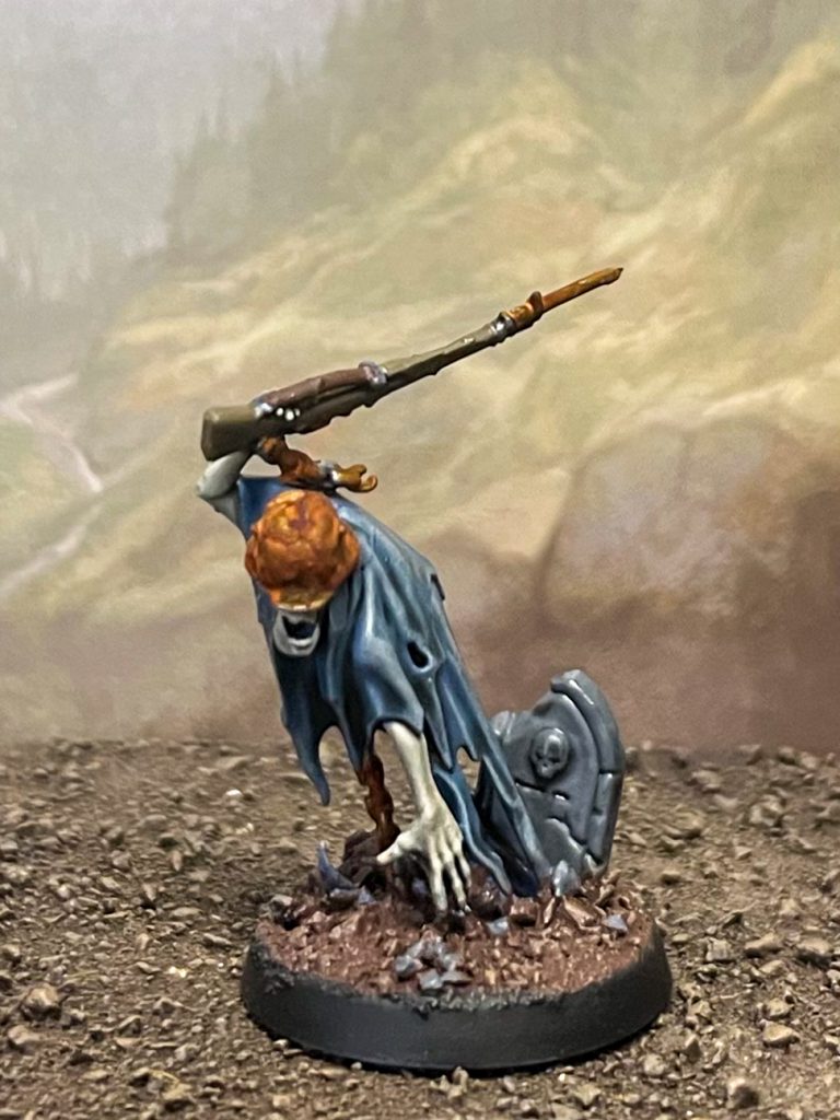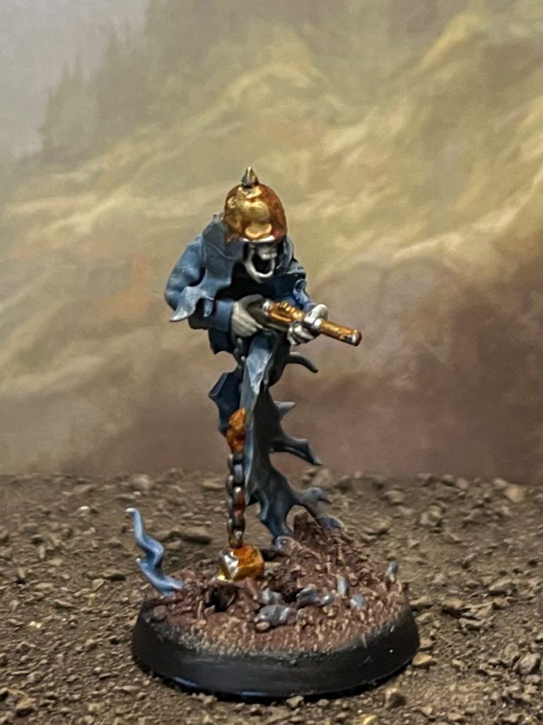 love love love the Dirty Down Rust stuff. It's highly toxic, smells terrible, and ruins brushes but that's ok because it looks wonderful! I apply it to the metals somewhat thickly and then wet my brush with a bit of water and spread it around a bit. The thicker parts dry darker and the lighter adds some discolouration around the rust so it's not such a sudden change between that and the silver. I love how the orange of the rust contrasts nicely against the blue-grey of the robes adding a sense of the reality and physicality to parts of the ghost models.