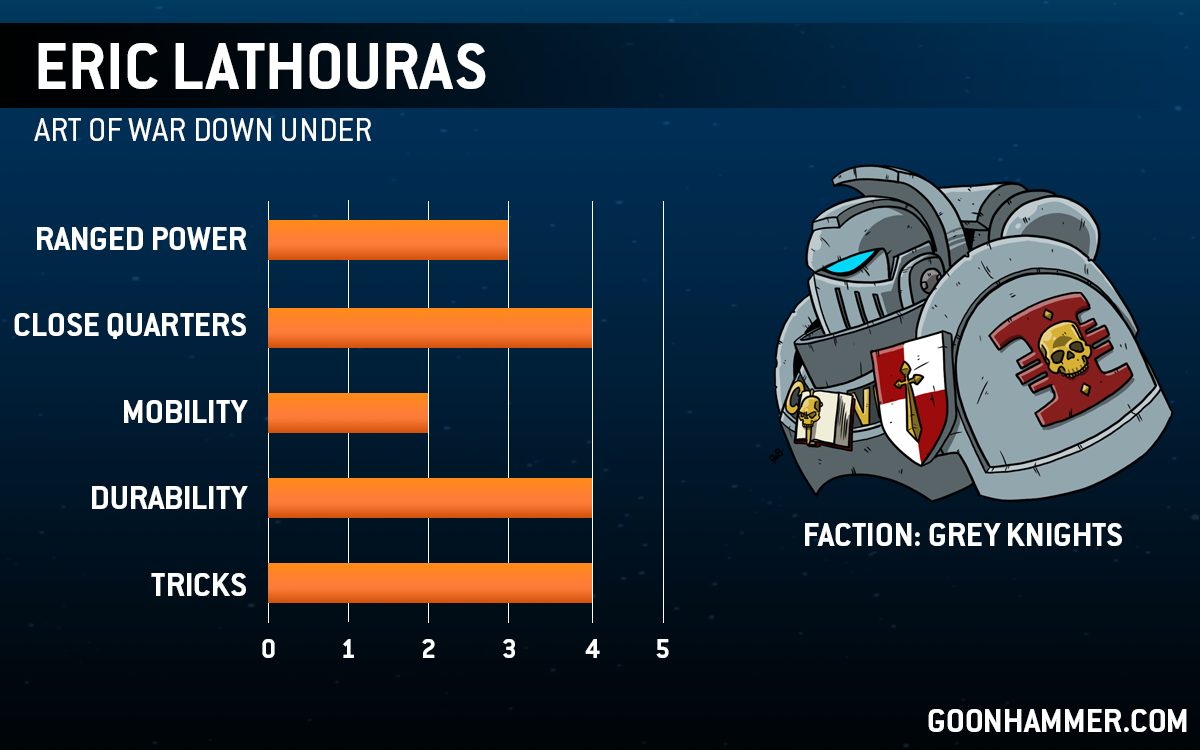 Who is Erik Lathouras? Well let’s just say he’s a man with back muscles of steel. Erik has conquered all of Australia whilst wielding 300+ gaunts and played a critical part in shining a light on the land down under. He has become a man who prides himself on playing the obscure and oft times neglected factions to perfection.
