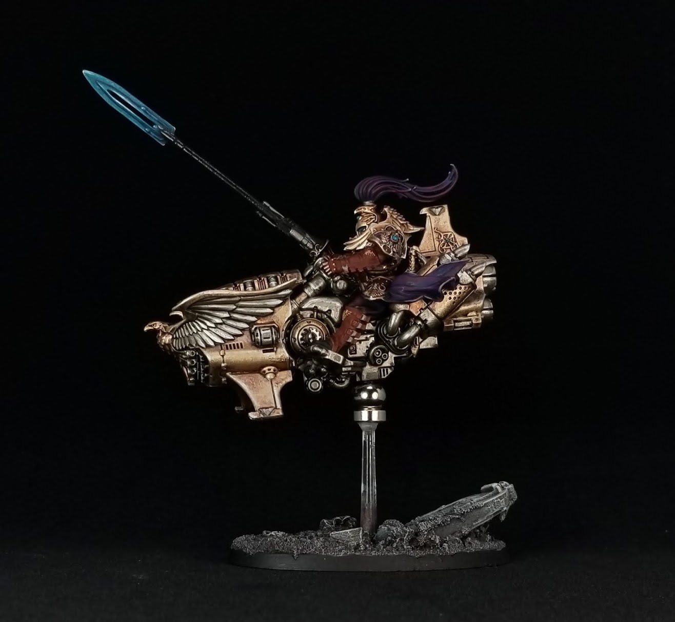 Shield-Captain on Dawneagle Jetbike [9 PL, -2CP, 178pts]: Auric Aquilas [-1CP], Captain-Commander [-1CP], Hurricane Bolter, Indomitable Constitution, Misericordia [3pts], Superior Creation, Ten Thousand Heroes [-1CP]