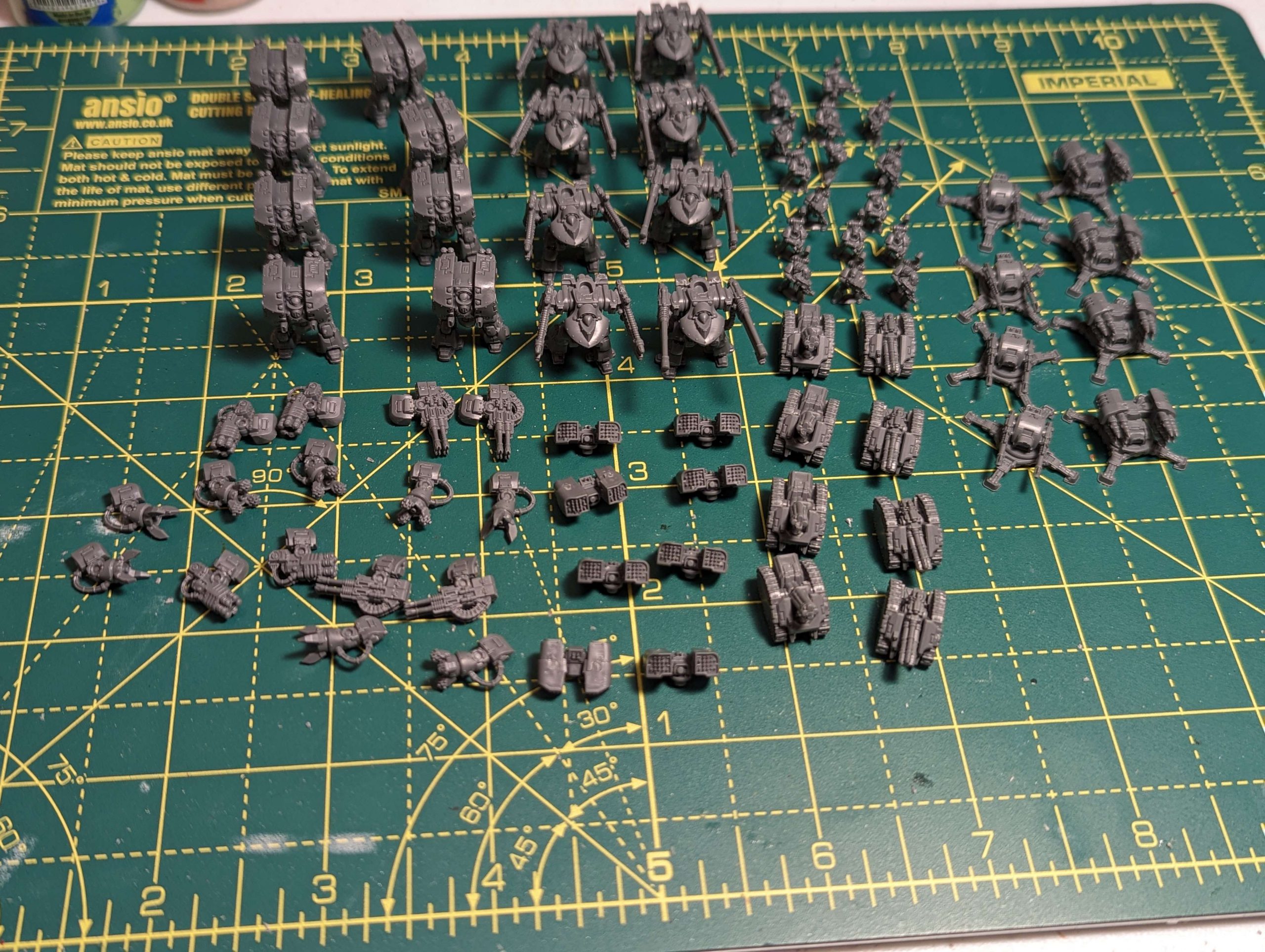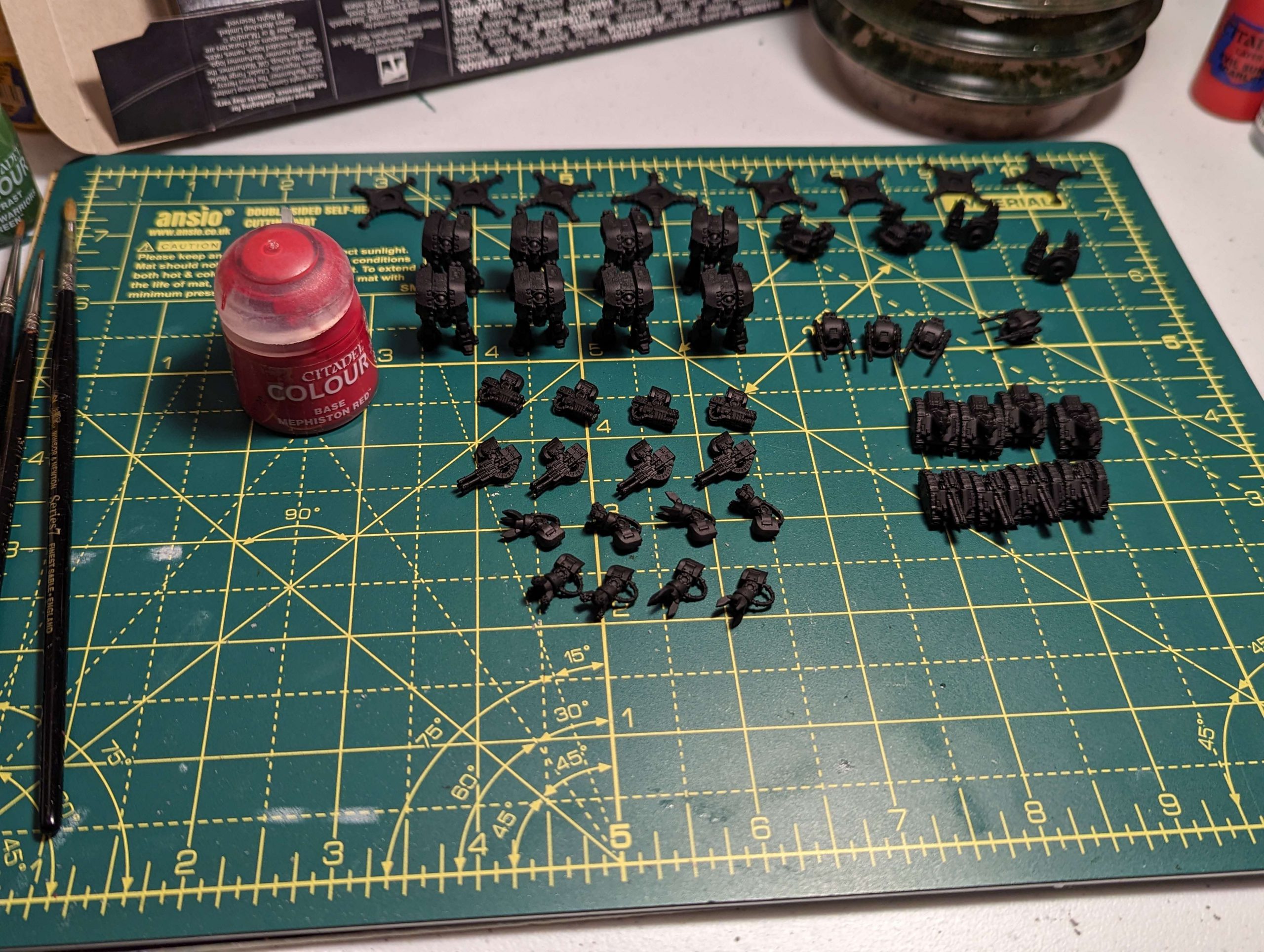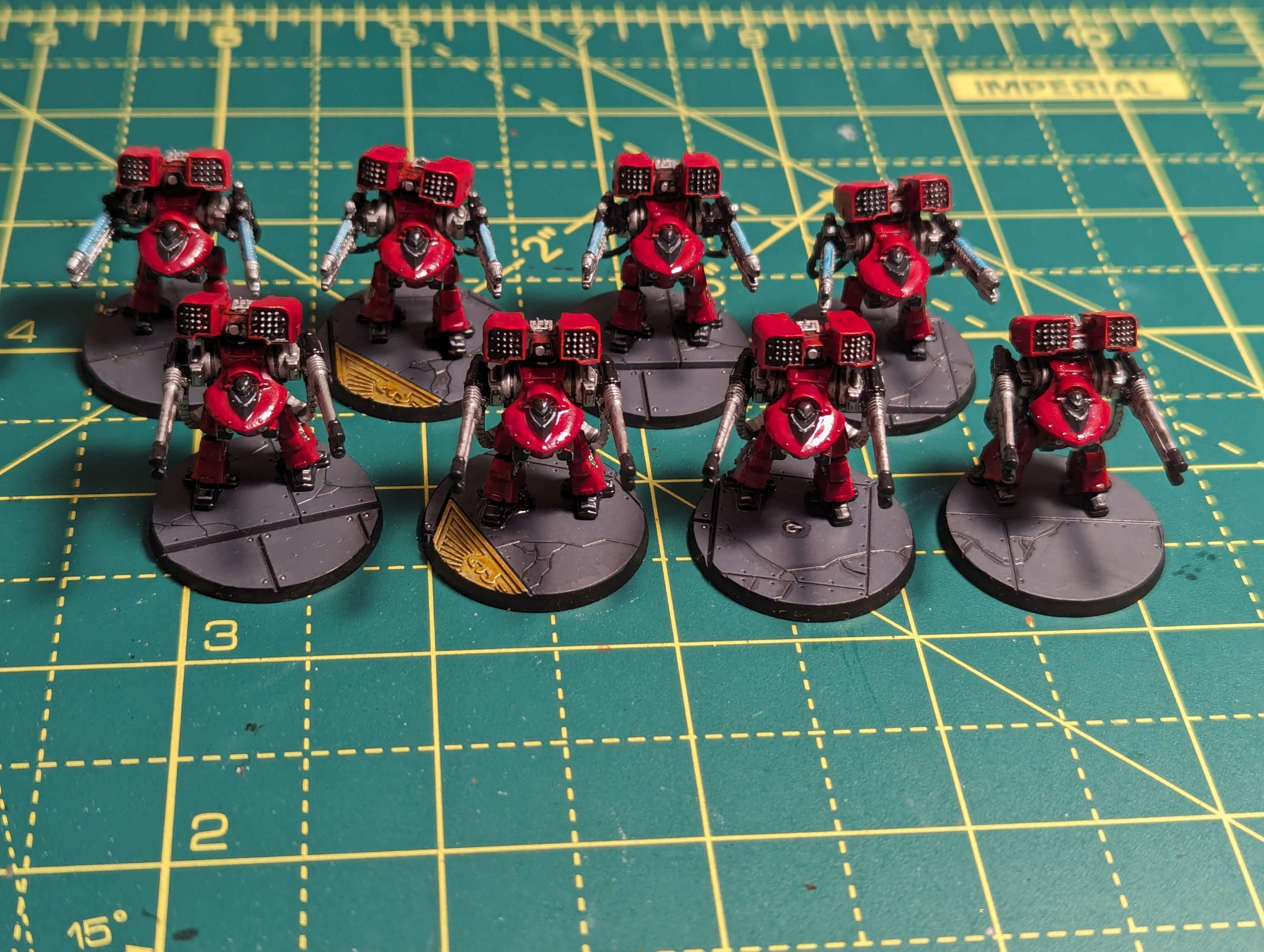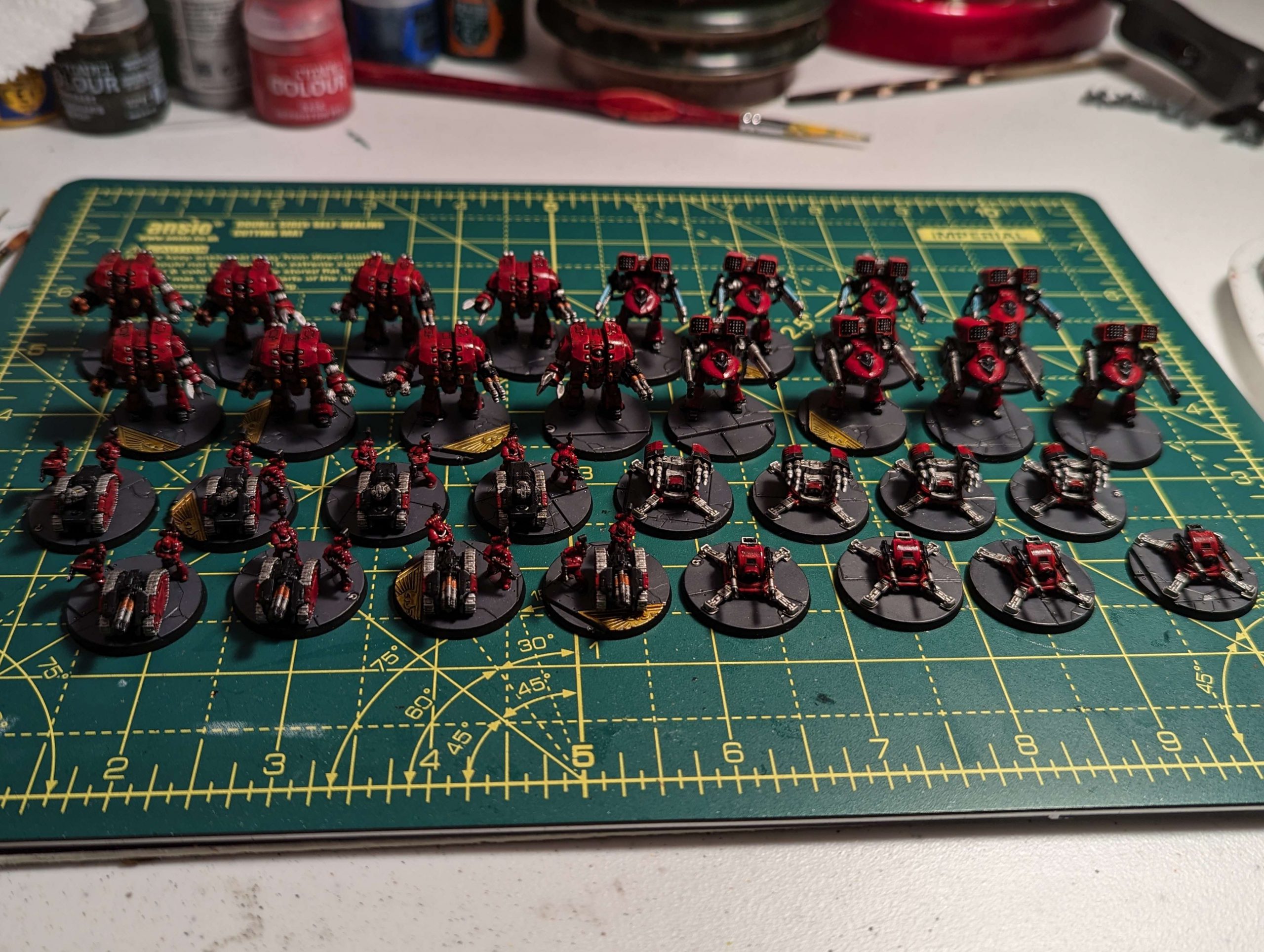 I bought two the Legiones Astartes Support boxes, as it allows you to have single loadout detachments of dreadnoughts and Rapiers (mixed Tarantula detachments are completely fine because of their rules). This means I had a tidy pile of 32 bases of miniatures to build and paint.