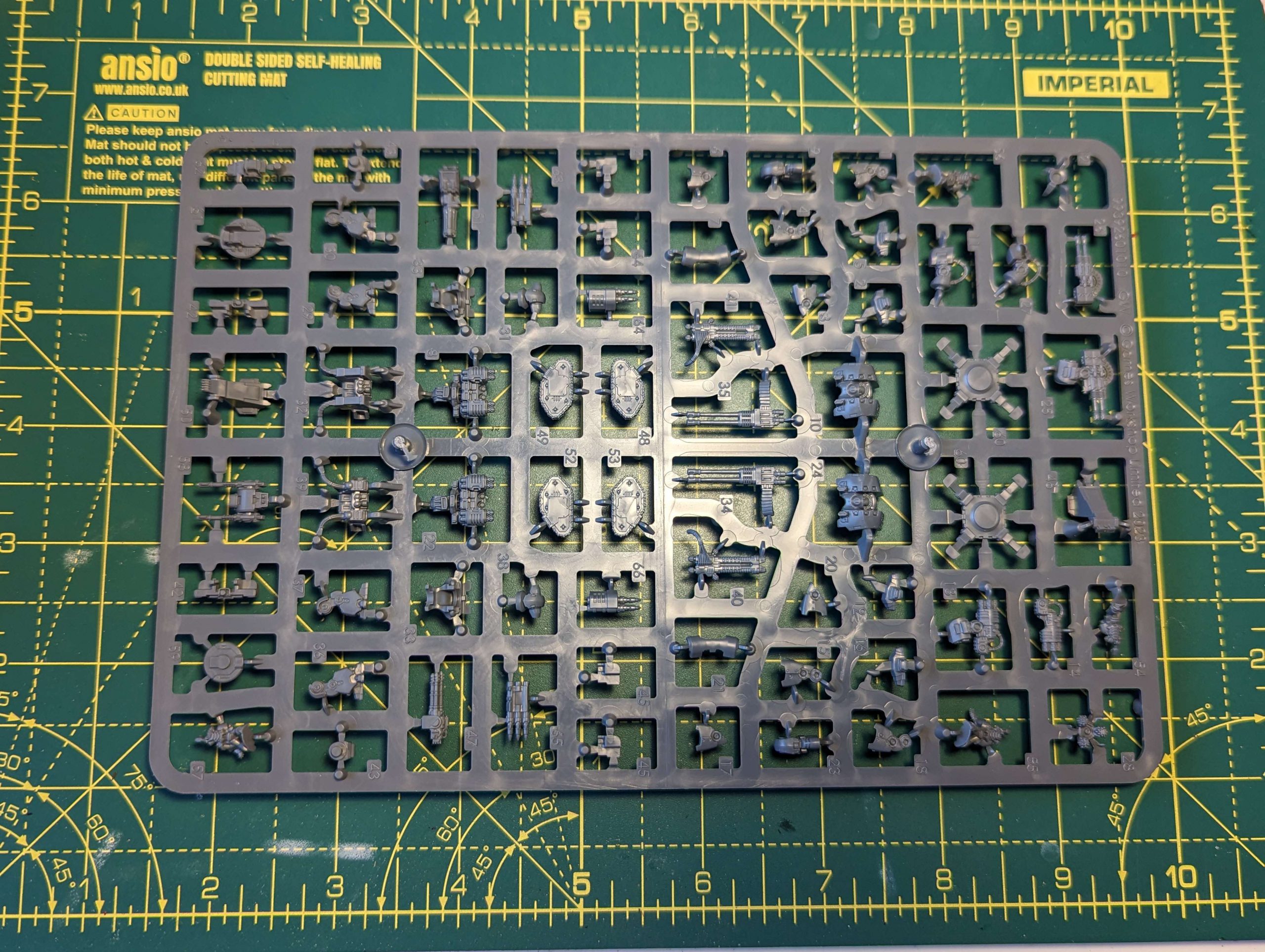 This is a set of well-designed miniatures that assemble fairly quickly and look good on the tabletop. The downside (needing two boxes to do mono-loadouts in each detachment) is a consequence of cramming eight different units into the sprue (versus six units, all of them smaller, on the Solar Auxilia sprue).