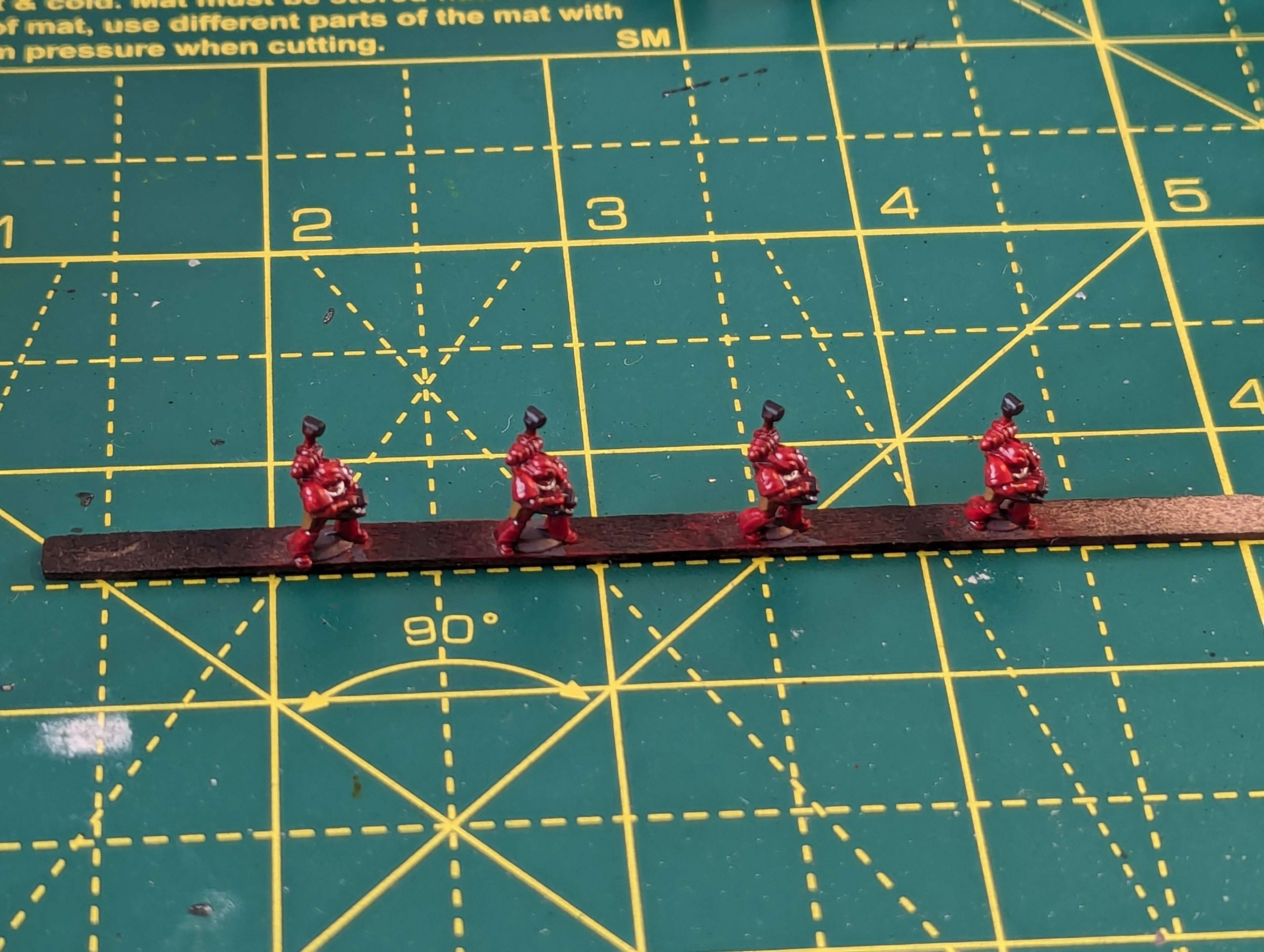 The infantry were glued to coffee stirrers with small blobs of PVA for the purpose of undercoating and painting.