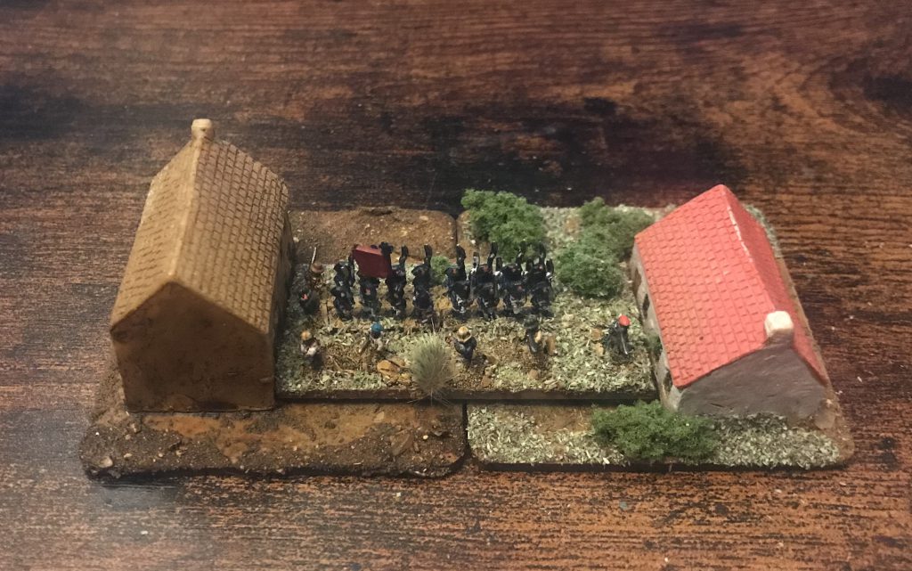 After a bit of experimentation that would probably have been immediately solved through a tape measure, I found that if the buildings were placed around 5mm away from one edge of the tile, there would be enough room to fit one of my line and/or cavalry bases between them. This means keeping a fairly clear passage on one side of the building tiles, but being able to create small alleys and ginnels between buildings when placed back to back. This will create some movement options around the board - areas impassible in towns to units in line, but perhaps passable at a penalty in column, or freely passable for skirmishers, allowing them to move through the town in any direction, with wide road spaces for line infantry and cavalry.