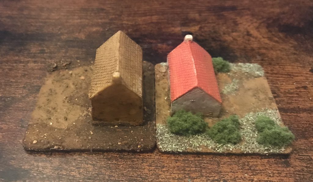 I've got confused enough about what buildings looked like in rural Haiti that I think digging into that will form an article in and of itself, but the last major thing I am considering before starting is how to place buildings. As I'm working with my 6mm army, I want to use buildings in such a way that they look like a town or village, but also allow fully ranked line units to pass though without awkwardly perching them on top of the roofs or having to deploy into column. The placement of buildings on each 50x50 tile then becomes important, because if two building tiles are placed next to each other, they need to have space for a 50mm wide base to pass through.