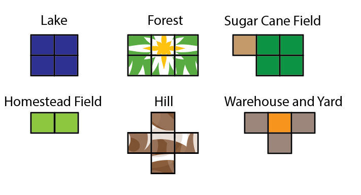 With the above - 2 hills and forests, 2 cane fields and 3 homestead fields alongside a lake and warehouse - we've accounted for 46 of the 100 planned tiles, and both hills and forests could be significantly larger. As long as the shapes tesselate, and they should, given the use of a consistent grid for their shapes, they will remain modular enough to switch them around, with plenty of space for scattered buildings and other single tile layouts. The asymmetric layouts of the cane field and the warehouse and yard do admittedly restrict where they could go, but we'll cross that bridge when we come to it.