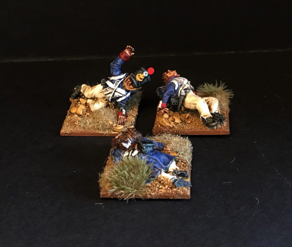 I got a bit lost in the image there, but the main thing was objectives, right? What objective markers could the Guard march to if not places where the infantry of the Ligne have tried, and fallen? Casualty models from Perry and Front Rank make for excellent objective markers. Here, a fallen Line infantryman shows where the enemy were driven back, and a tenuous foothold must be reinforced. There, the shattered remains of a battalion cluster around a bridge that must be stormed.
