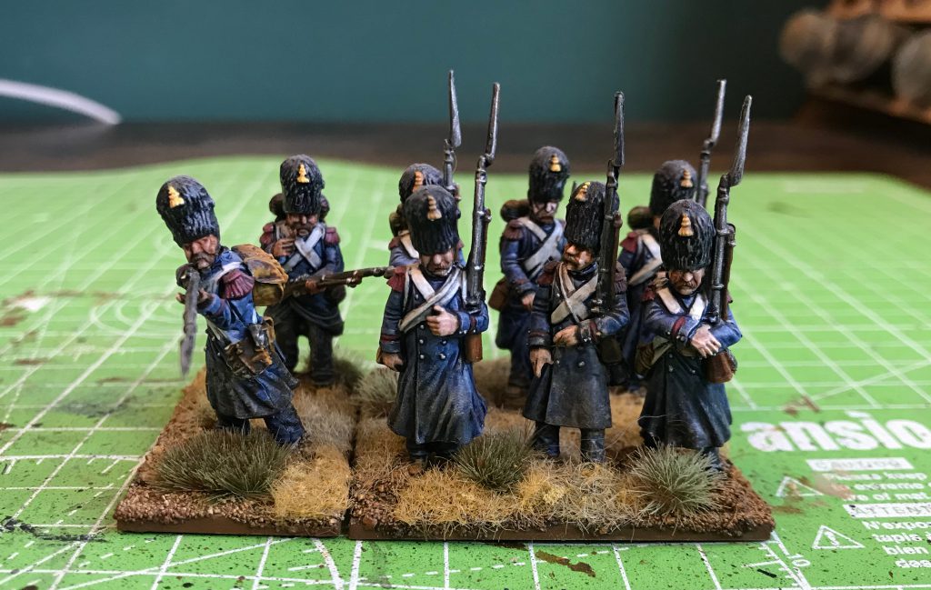 Victrix make some well reviewed Old Guard that are in heavy blue greatcoats, making them an easier first step into the period. I grabbed a box, stuck six on one base and two on another and painted them entirely using the box art as a guide.