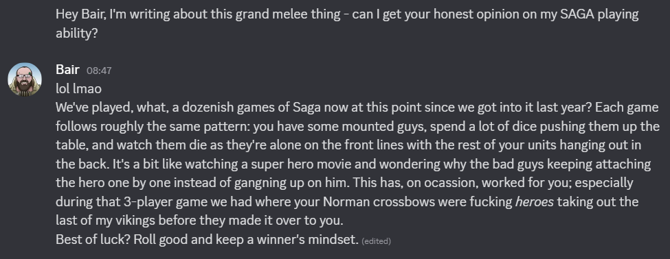 I'm going with the full expectation of taking home the Valhalla award for coming in last place overall, and the win-to-lose ratio of 0:6. While I've got better at games generally in my time writing and playing stuff for Goonhammer, I remain uniquely terrible at Saga. There's something about the battleboards system and the fact that Hearthguard are no harder to kill than anyone else that breaks my brain. I've probably played new Saga convert Bair more than anyone else at this point, so I asked him for his opinion on my chances: