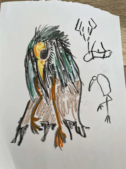 It isn't much, but it's there. I talk the curve of wing, the prominence of beak and skull, I hum and caw and croak the bird-spindle legs, I drone unmusically of magpies to conjure shawl and cloak. I remember that it should speak through me, in me, holding therapist and shaman and friend as a triangulation of what I want to achieve, a frame - a gap - to autocreate. I do not draw well, but I draw anyway. There it is, Blessed Crow, Bendigeidfran the Giant, or at the very least here is one version of it. Feathers, bones, metal, plastic, a near infinite potential for - let's be honest - bizarre nonsense is shrouded within. To pull it off there’s a lot of people to talk to, and a lot of learnings to find. Time to get on with it.