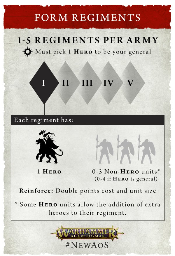 must include at least one regiment and can have up to five regiments total. A regiment is made up of one hero and up to three units. Under the Battle Profiles section you'll see what units are allowed in each hero's regiment. These are extremely permissive though and very rarely will you find yourself in a place where you're not able to take a unit you'd like. Your General's regiment can instead have up to four units, however you might not want to have many in there...more on that below.