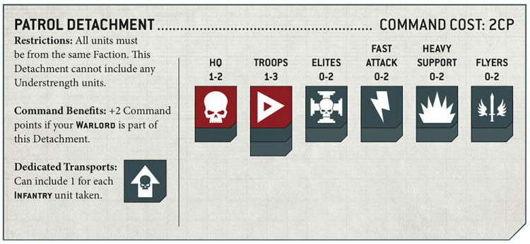 A major part of the appeal of a Combat Patrol is the "40K in 40 minutes" style game, where you have a fast and furious battle that comes to a close with a pretty definitive winner most of the time. Army building is limited to a single patrol detachment with the exception of Knights armies, which can only take a single Super-Heavy detachment. Players receive 3 Command Points (CP) to work with.