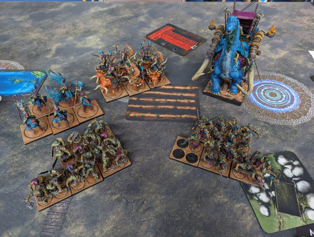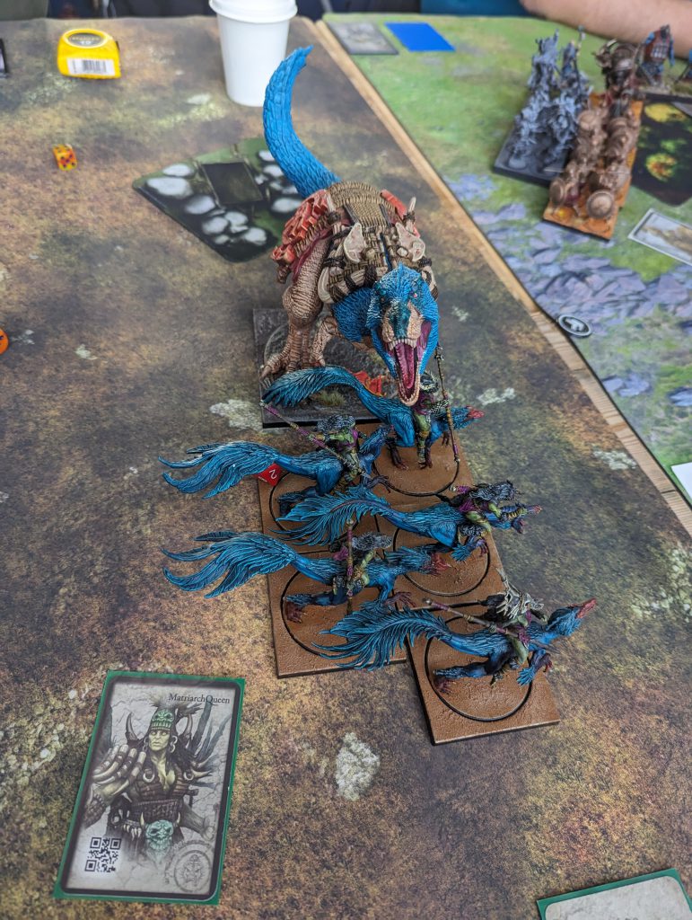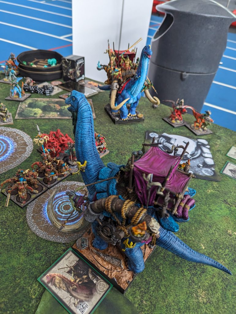 A last minute drop had left us a player down, so Giannis had stepped in with a borrowed W'adrhŭn army from another player to even things out, and would be my opponent this round! By Giannis’ own admission, he doesn’t spend much time playing (which given that this is his day job I can understand him wanting a break from it!) and his list is what I could remember from memory, being mostly spares I think it might have been under points or with more artefacts I couldn't remember. This was his first time using W'adrhŭn so we knew this would be a fun game of pushing dinosaurs across the board and seeing what happened.