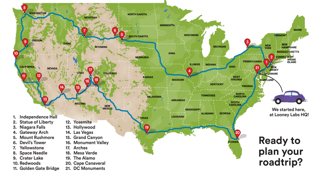 Across America Fluxx, the Looney Labs team are including maps that show the actual location of the physical locations for these Keepers. At the time I talked to Kristin, Andy was taking a 6-week road trip inspired by the map in