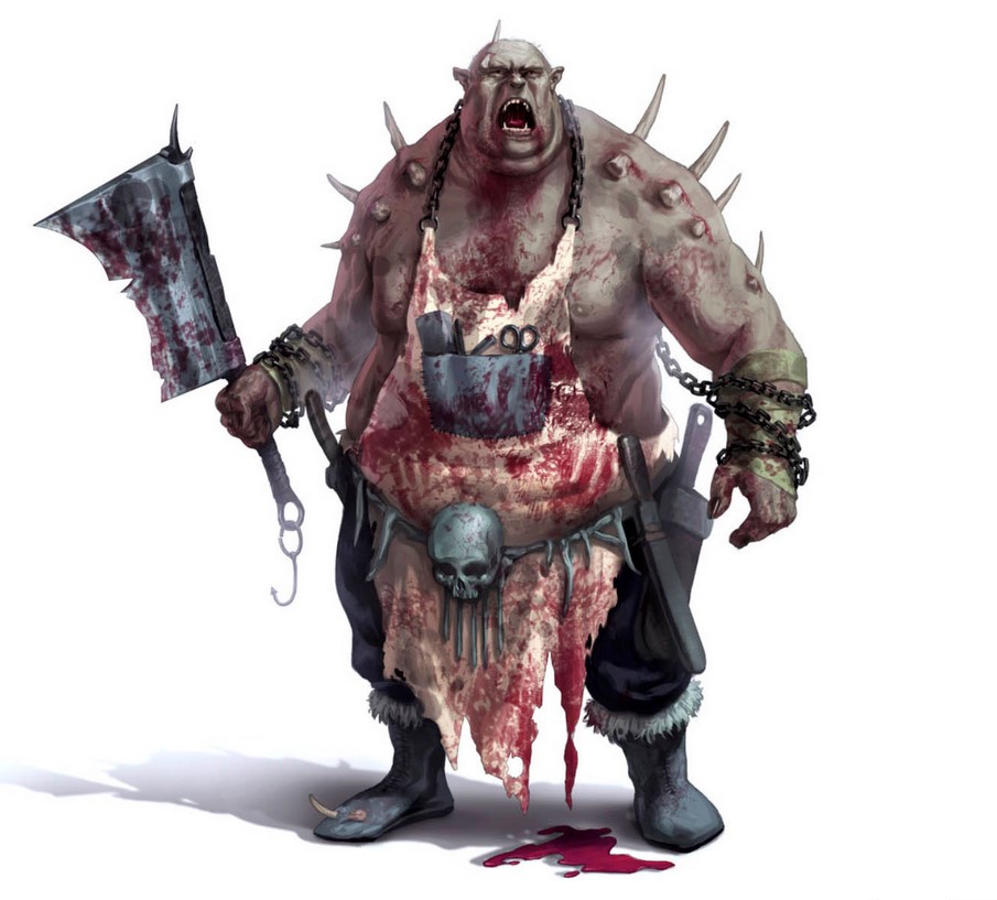 It's no surprise that in the face of this hunger, the Ogors worship an aspect of Gorkamorka that they call "The Gulping God," a divine creation of insatiable voracity, often represented in their imagery by a circle with sharp teeth. As you can imagine, Ogor society revolves around cooking, eating, and finding more things to cook and eat, for although Ogors will eat their food raw in the heat of the moment, they prefer food that's been prepared and cooked by one of the tribe's Butchers. Butchery for Ogors is less of a mundane mechanical process and more of a sacral communion with the divine (and it just tastes better with a bit of salt and pepper, y'know). Eating is a religion and Butchers are the clergy, their close connection to the Gulping God granting them potent magical abilities akin to those of a human wizard. Shower the enemy in great globs of boiling fat? No problem.