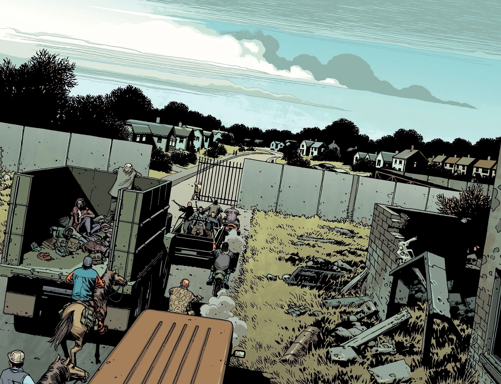 The last issue of TWD is set many many years after the series. We get a glimpse at a reformed world, there is structure and safety again. Walkers are viewed as so harmless that we see Maggie's son showing them off like wild animals in a cage. The world hasn't gone back to what it was, horses still seem like the preferred mode of travel, but the railroad is making a comeback under the instructions of Eugene.