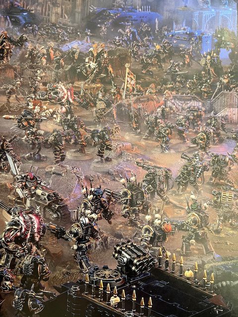 The toll on the fleeing Imperials is grim. The Night Lords are in their element, giving furious pursuit and bleeding the defenders at every opportunity. Indiscriminate Iron Warrior artillery strikes pummel friend and foe alike. The Chaos Knights of House Mandrakor cut off the Titans of the Legio Tempestor, smashing them like a hammer on the anvil of the attacking daemonic horde. Surrounded and on the verge of destruction, Princeps Drentor of the