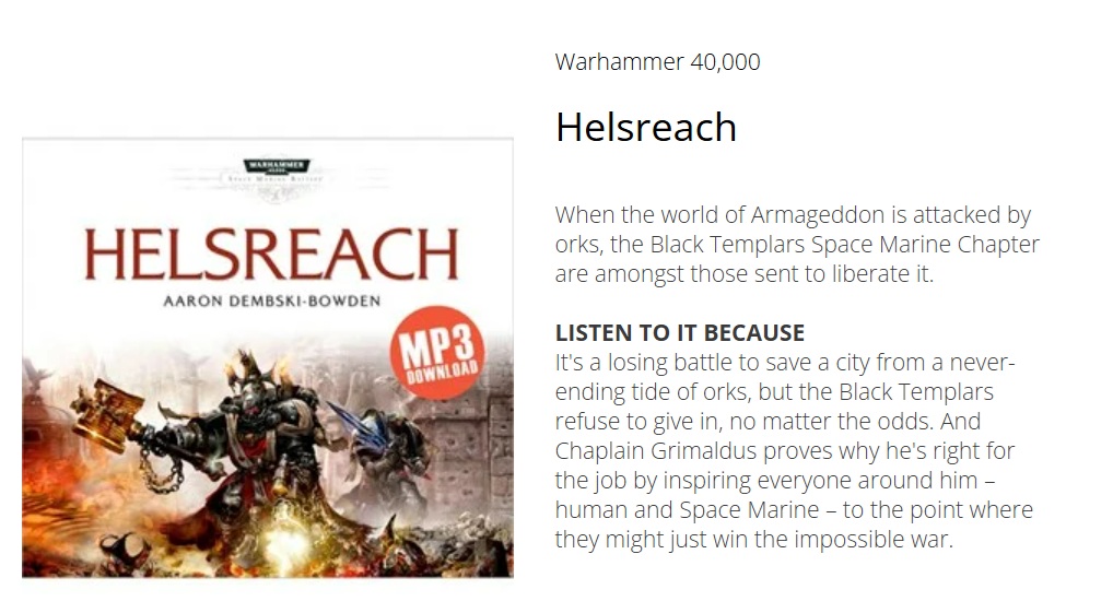 Conversations about one format being better than the other, I realized, missed the point entirely. Sure there was plenty I preferred in the paper format, and it's still my primary choice. But I've also had an audiobook ever at the ready for whenever I need to hop in the car. Look for some audiobook coverage in my work for Goonhammer this year.