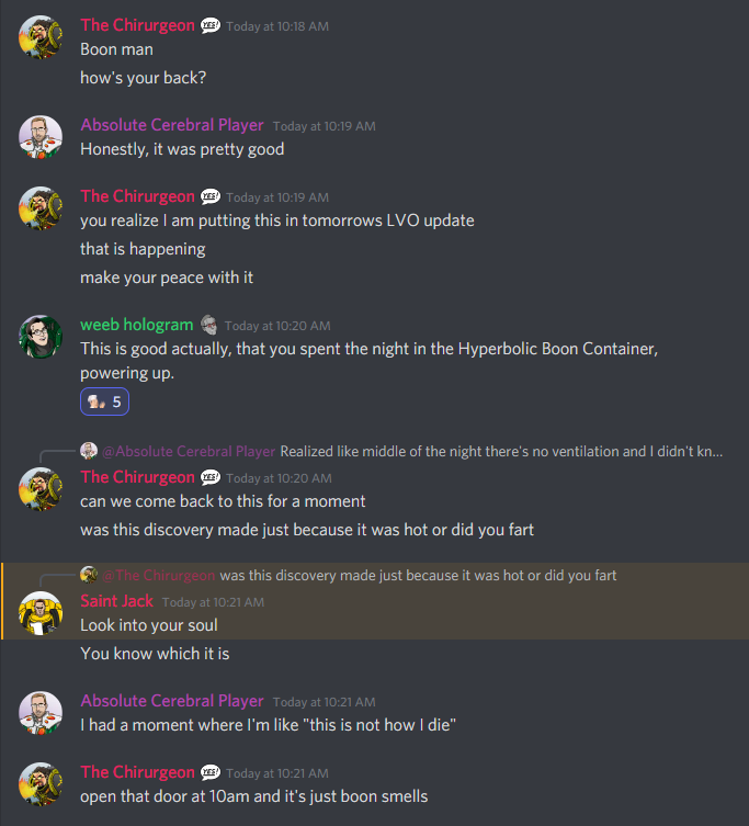 Our Patrons on Discord have lovingly dubbed this "the Boon Cocoon" and reader let me tell you that there is absolutely no ventilation in there - once that door is closed shit gets real.