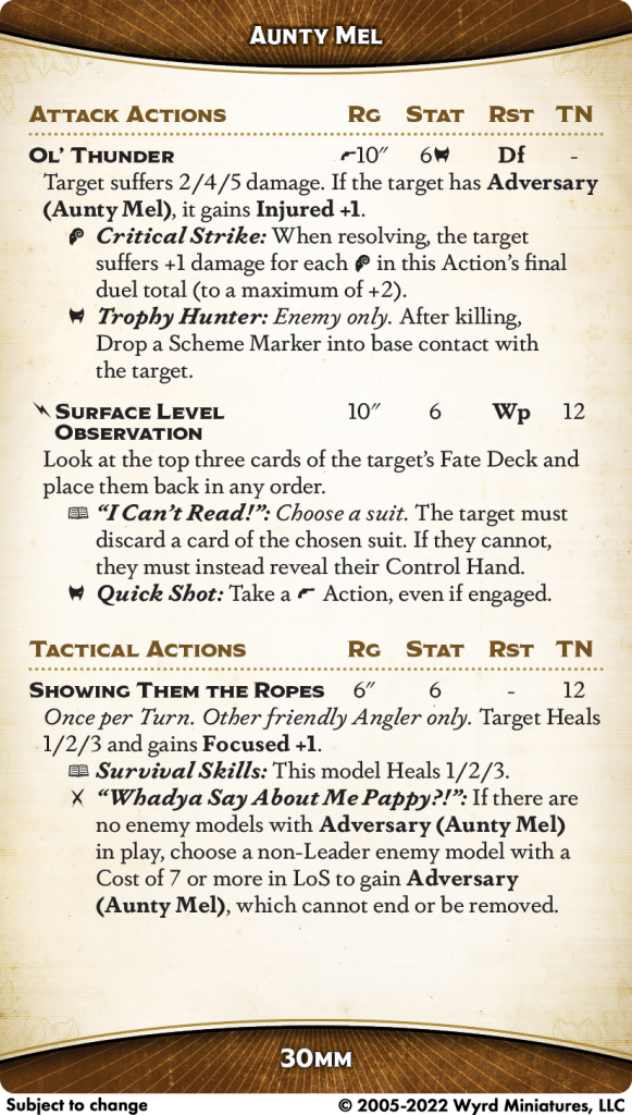 After all that, you'd be forgiven for glancing over the tactical action, but Showing Them the Ropes is actually... pretty reasonable. It's a keyword-locked version of Foul-Mouthed Motivation, except a full action instead of a bonus. This type of action is often known as "AP transfer," since you're using an Aunty Mel AP to give another model an effective AP (via focus). It's a little better than that due to the heal, but generally Aunty Mel AP are so strong (for the above-mentioned reasons) that you're better off just using them to shoot and focus with. The caveat is that both of the triggers here are very good, so if you have the appropriate card and circumstances to use either, you should strongly consider it. White Whale is so key to Mel's playstyle that you'll really want to turn it back on again as soon as your target dies, and a second 1/2/3 heal really pushes the healing here into the "difficult to deal with" range - healing up to six damage across your crew and handing out a Focus is real AP efficiency.