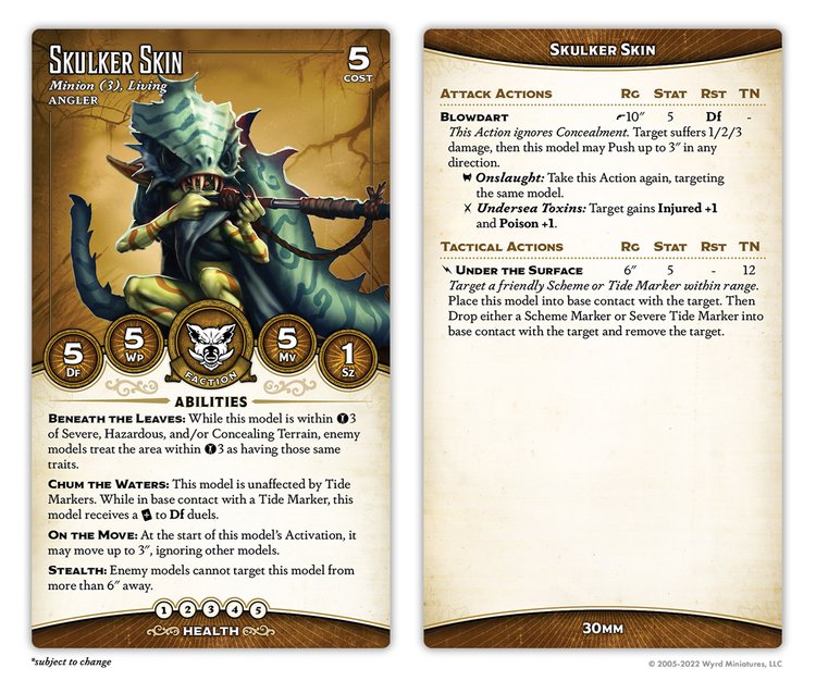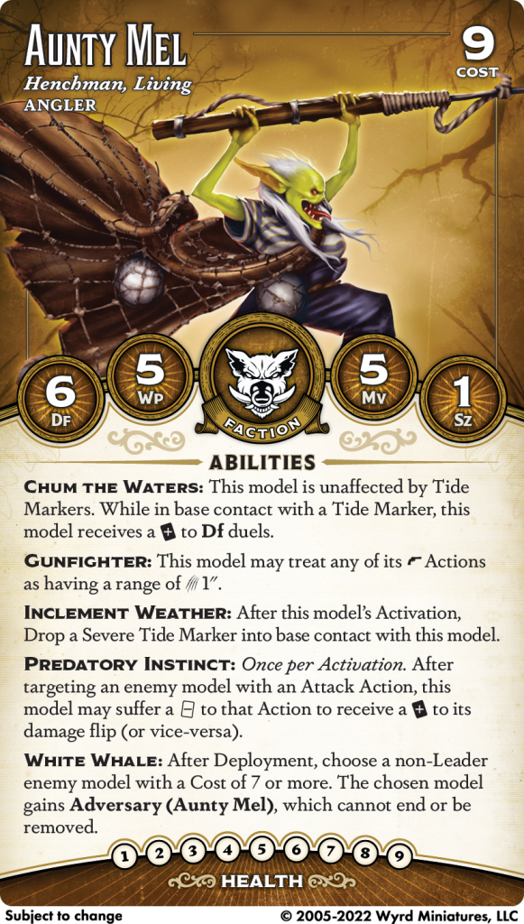 I'm pumped to put Angler on the table. The keyword is very cool - good card velocity, hand pressure, a mixture of ranged and melee attacks, and marker generation. I love marker crews, and I love that this marker crew doesn't just fold in the face of marker removal; Tide Markers are a value add and something that they can riff off with their abilities, they're not a lynchpin of how the crew plays. I might make some with clear resin.