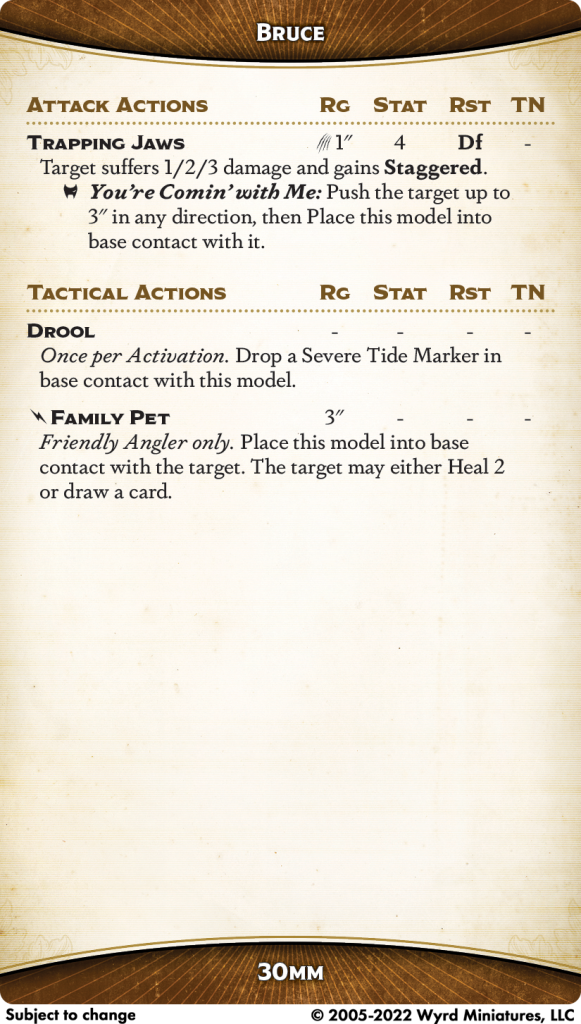 Let's start with Family Pet, a 3-and-a-bit-inch place (remember, base width) that doesn't require you to flip any cards, draws you a card or heals the target. He can Drool, too, dropping a Tide Marker where you need one. And while his melee attack isn't great, especially at Stat 4, it auto-Staggers and the You're Comin' With Me trigger does exactly what you want him to do.
