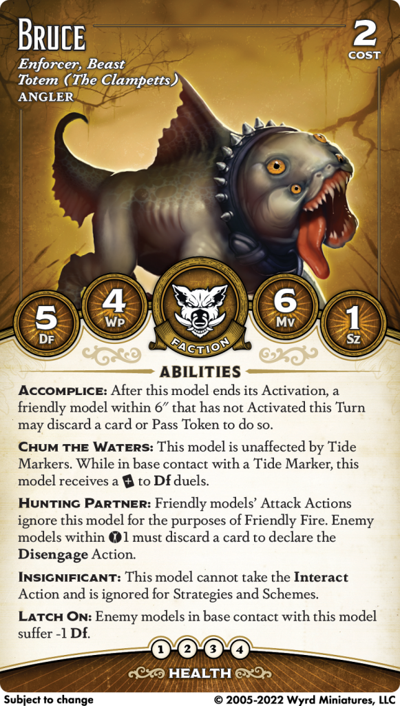 Let's not bury the lead: Accomplice is a crazy powerful ability. Absolutely bonkers. Activation control is the name of the game in Malifaux, and Accomplice gives you pinpoint activation control. Of course, it matters a lot if the Accomplicing model is able to set up a good activation for its follower, and Bruce is really, really good at that. He's about as fragile as you expect a totem to be (although Chum the Waters is not unreasonable defensive tech), but he's fast, even faster than he looks with Mv 6. Latch On means that just by existing he's debuffing enemies and setting up the kill, and Hunting Partner means you don't suffer any downside to doing that. Sure, he's Insignificant, but so are many totems, and you really do not care.