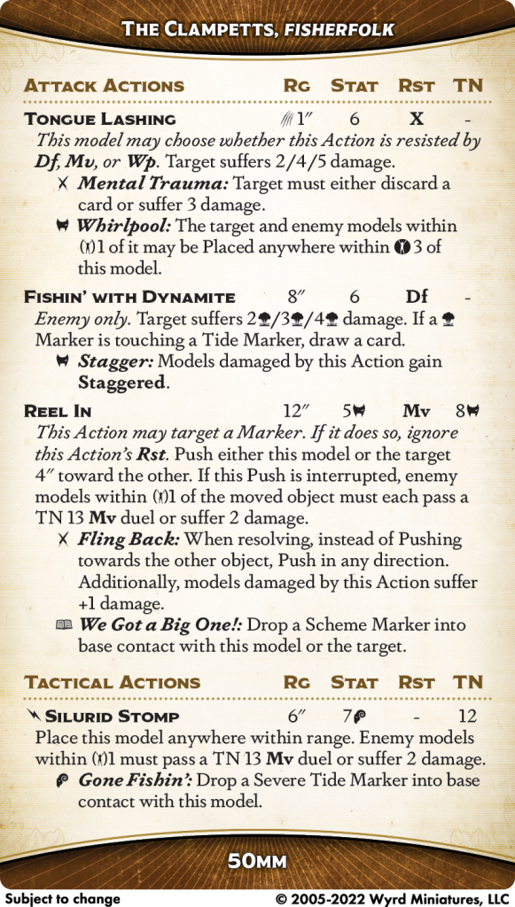 The Clampetts' back of card is quite impressive, and I can see a lot of fun possibilities here. I'll start with Silurid Stomp, as their only Tactical and only Bonus Action; you'll be doing it every turn. It's a Leap that triggers on a suitless 5, pulses out damage, and has a built-in trigger to drop a Tide Marker. This is, to be blunt, bananas, and it's a huge part of their kit. Leap is model-defining on almost anyone who has it, and much hinges on the TN and whether it's suited or not. This is not suited, with a low TN, and it does damage and generates the crew's key resource. On a 50mm base, it's even better than normal, since you get the base width as an increase to your displacement. If you time this right, it'll guarantee you always get a Scheme where you need one from Brackish Bullies.