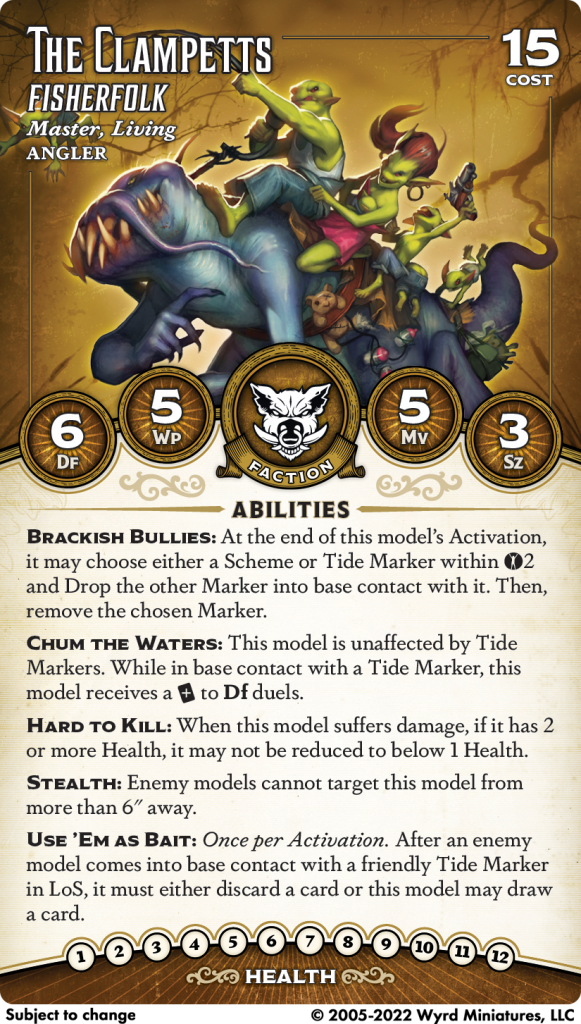 Their last two abilities also deal with Tide Markers. Brackish Bullies lets them swap a nearby Scheme for a Tide Marker, and vice versa. Based on how easy it is for this crew to generate lots of Tide Markers, I think you'll be doing the latter more than the former, and it will make some Schemes quite easy to score, though since it's not friendly Scheme Markers it'll be a useful way to remove an enemy Marker without expending AP. Use 'Em As Bait seems like the headliner ability; once per activation, after an enemy model comes into base contact with a Tide Marker in LOS, they must either discard a card or you may draw one. This slightly unusual wording captures situations when enemies move onto Tide Markers as well as situations when you move or drop a Marker on an enemy, and it should be trivially easy to trigger in almost every friendly activation once the crew gets up close.
