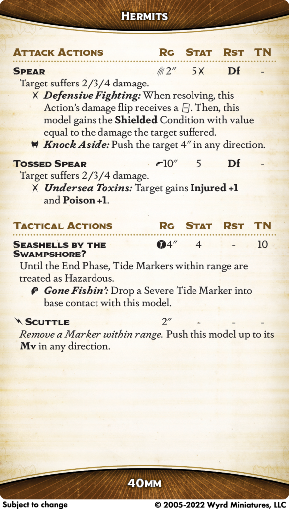 Finally, Scuttle is... pretty much just what the doctor ordered. You don't tend to have a use for Tide Markers in your backfield, but you'll leave a lot of them behind between Inclement Weather and Gone Fishin'. Scarf them down and make your slow-as-hell Hermits actually quite speedy. Remember it's a Push, not a Walk, and also remember that it targets any kind of marker; once you get engaged, this is basically all upside. Bayou is not lacking for marker removal, of course, but it's nice to do it as a bonus action on a model you're taking for other reasons and even get something out of it.