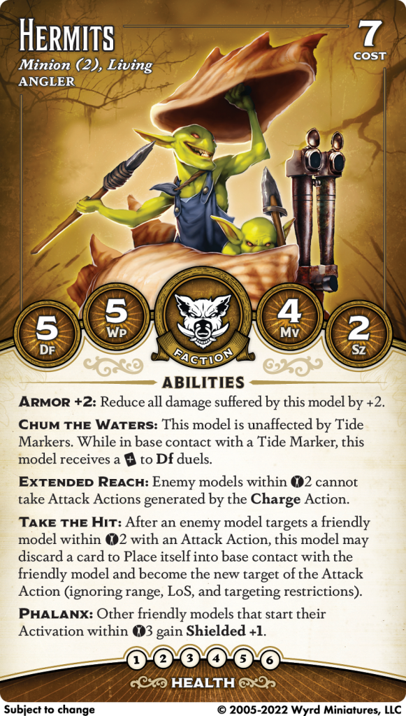 I think Hermits are nasty and are reasonably likely to show up out of keyword. They don't particularly need the Angler keyword for anything, they're the only Take the Hit model in the faction, and they're both Durable and Absorbent (like Brawny™ brand paper towels - the towels for Truly Tough Messes).