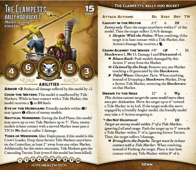 Angler, focuses on Tide Markers. These 30mm Severe markers provide a +twist to Df duels for any Angler in base contact with them, and Anglers also ignore their traits (just Severe at baseline, but if you make them Hazardous or give them other traits, the Clampetts are unaffected by those too).