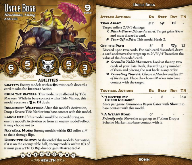 annoying. He sits there, with his fat 50mm ass and his gator. You can't Interact near him without discarding a card. You can't make attacks near him without suffering a -twist to damage. Every time he activates, all of your nearby models have to test or gain Distracted (as long as he's at least partially over the centerline. And you can't even move him! Plus, he spews out Tide Markers every time he activates, for free - so attacks against his hefty Df 6 have to deal with a built in +twist, too.