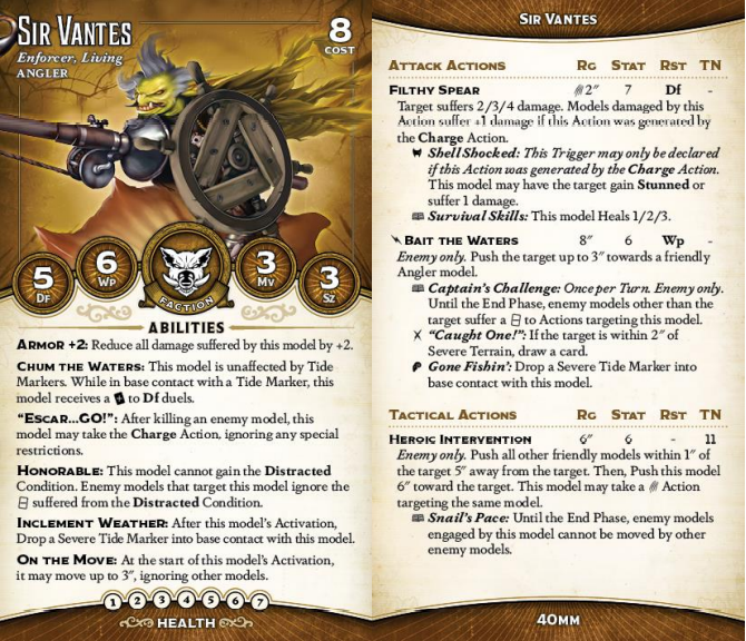 Sir Vantes wins a special prize: he is the coolest model in the entire book. Armor 2 with good defensive stats and built-in self-healing? Sure. Stat 7 attack that goes to a 3/4/5 on the charge, or a 4/5/6 with a mask? Awesome.