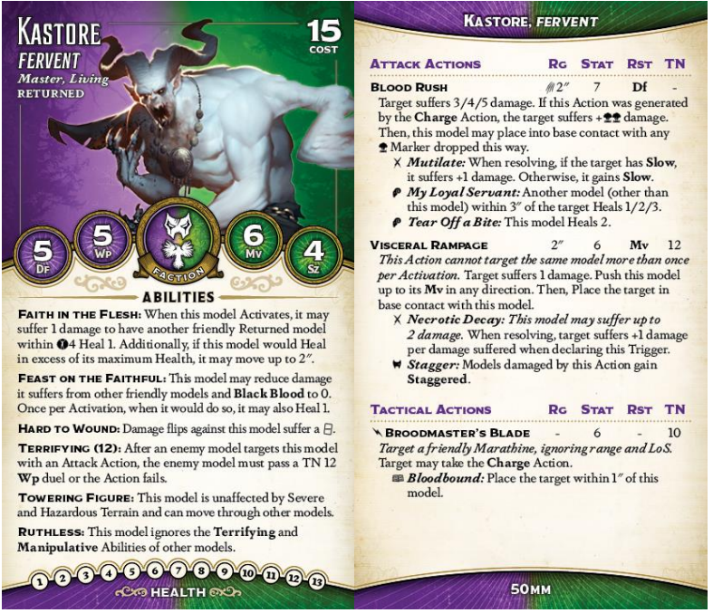 His second attack would have to be very cool to compete with Blood Rush, but luckily it does something different and powerful enough that you'll use it a fair bit. Visceral Rampage has a 2" range but no melee icon (so you can't Charge into it), and can only target a given model once per activation, but those restrictions are definitely necessary given its power. It's a stat 6 targeting Mv that inflicts only 1 point of damage but lets Kastore push 6" (remember he ignores models