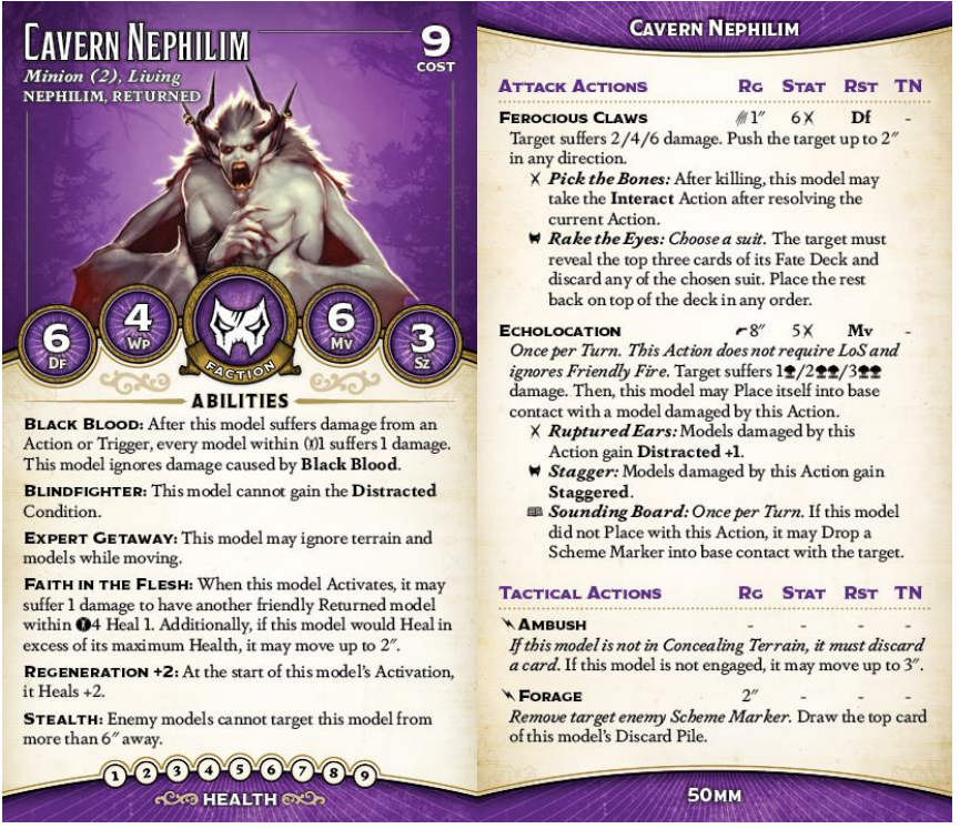 Having skipped arm day, their attacks are significantly less impressive than a Mature Nephilim (that min 3 really matters, as does a 2" engage, and Matures have much better triggers), but they're blessed with a ranged attack. Echolocation is extremely cool: low range is mitigated by ignoring LOS (and thus effectively ignoring Cover and Concealment in addition to Friendly Fire), and low Stat is mitigated by targeting Mv. The damage track isn't much to speak of, but those blasts are great, and the ability to