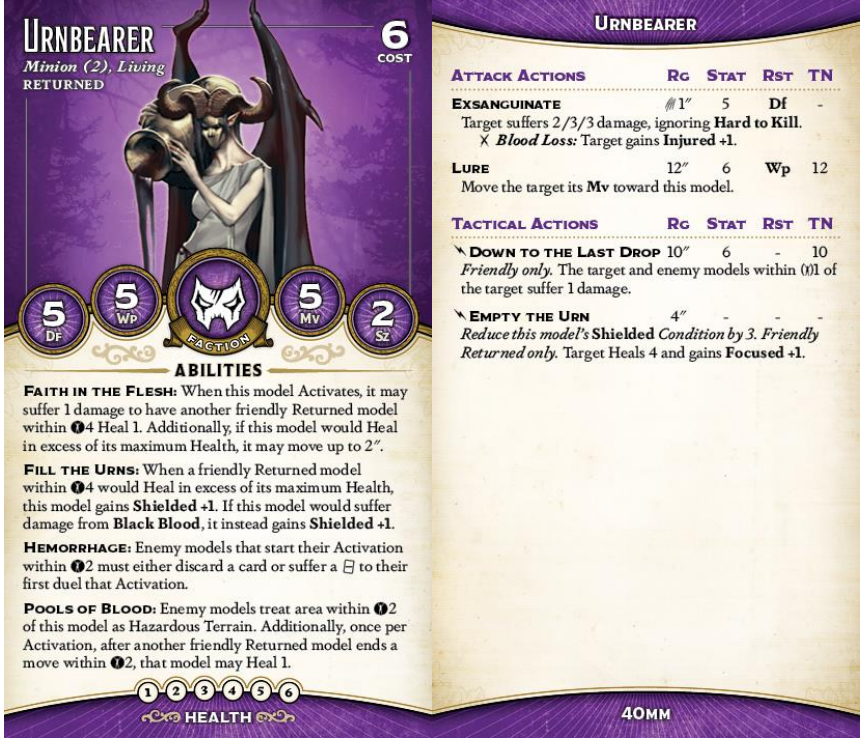 In those instances where you're too spread out to benefit from Empty the Urn, you can use Down to the Last Drop to ping out some unresistable damage, a great action on the Spelleaters and a great action here. Beyond that, Urnbearers have Lure, always a reasonable action (though probably less necessary here than in other crews given the Returned keyword's speed) and Exsanguinate, which is very similar to Marathine's attack (though Stat 5 is a little unimpressive). Still, getting them into melee isn't the worst idea, since their auras make nearby enemy models very sad... it'll just make stacking Shielded hard since you'll be losing it to damage.