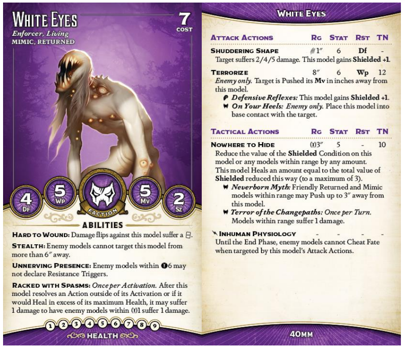 ton of health for his cost, which is good because he spends it on Racked with Spasms to pulse out ping damage. The synergy there is a bit odd; triggering Racked requires you to overheal, but it then damages you, which makes it less likely for you to overheal on the next heal... this creates some tempo issues, but free ping damage you don't even have to spend an AP for are great. Sometimes you'll be in a position to trigger this on 3-4 separate activations by pumping healing into White Eyes and it'll just ruin someone. You can also just eat the damage with Shielded, which White Eyes gains every time he hits someone. His attack is otherwise not