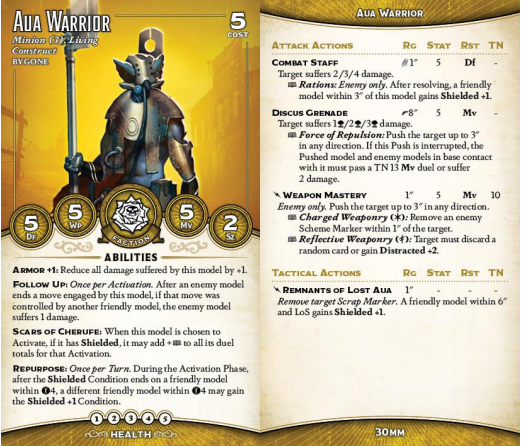 Ultimately, the biggest knock against Aua Warriors is that they can't declare a Tome trigger without hitting an enemy model with a stat 5 attack. And that is just not where you want to be. They don't draw cards well in Tiri1 and they don't really hand out shielded very well either. You can take 'em if you want - the models are super cool looking. But they just aren't that efficient, and that's a shame.