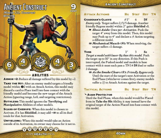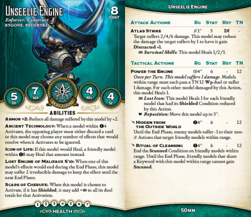 Its melee attack isn't terrible either, though stat 5 is pretty bad. This thing is slow and not that killy - it's not a beater, it's a support model. Power the Engine is mostly going to be used to damage friendlies so you can heal (remember, you can relent to friendly duels now), which is pretty interesting in Bygone; you have support models clustered in the back who are Shielded to enable their triggers, and once they've activated you can Power the Engine to strip all that Shielding, convert it to healing, and send it forward (or sideways, to your Ancient Construct or the Matron).