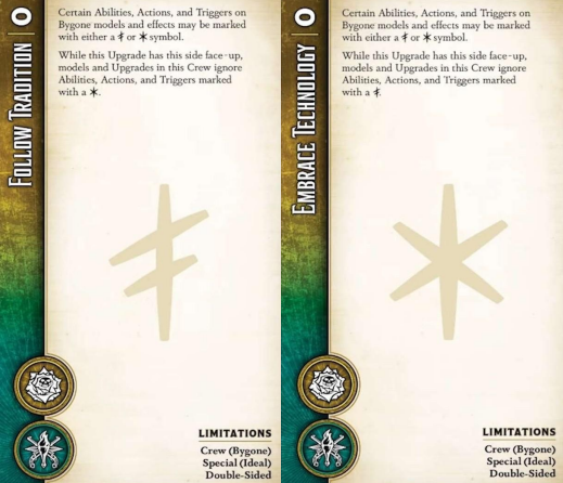 you the player rather than a model. The Ideal upgrade is two-sided: one side Embraces Technology while the other Follows Tradition. Each is represented by a symbol: the star for Technology, the cross for Tradition. Most Bygone models have abilities or triggers that are marked with those same symbols. These are typically extremely potent abilities, but they are only active if the proper face of the Ideal upgrade is face-up. At any given time, either Tradition or Technology is active and the other is inactive. When Tiri activates, she can flip the upgrade - and this is the