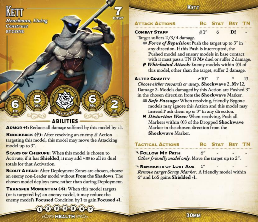 Kett's surprisingly tough, between Armor, his ready access to Shielded, his Henchman status (and concomitant Soulstone use), and his Ideal-locked abilities. Both are defensive; Knockback only function in melee but pushes the attacker back 3", knocking most enemies out of range to hit back, though you should look out for Frenzied Charge or Laugh Off as both abilities make this a lot worse. Transfer Momentum is more straightforwardly powerful and works offensively, too; Kett can