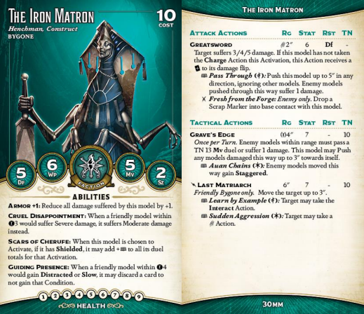 The Matron provides two things to any Bygone crew: Cruel Disappointment and an absolutely hellish beatstick. The former is one of the game's strongest pieces of defensive tech. Malifaux is full of 2/4/6 and 2/3/5 attacks, and stripping away their high end (or their potential to Red Joker a damage flip) makes them feel