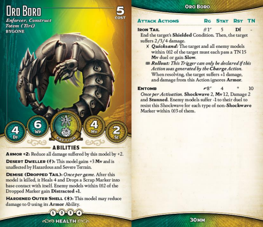 Tiri's Totem, Oro Boro, is the cutest little construct you've ever seen. He was Tiri's mother's last gift to her, and he faithfully protects his charge, accompanying her wherever she goes. Mechanically, he's the only Bygone model without Scars of Cherufe. He doesn't really need it, though- he's totally serviceable on his own. Df 4 is pretty bad, and he's only got 4 health, but Armor +2 is a lot and you really have to kill him twice. The Dropped Tail Demise trigger is cute, but what you're really taking him for is Entomb. This is a