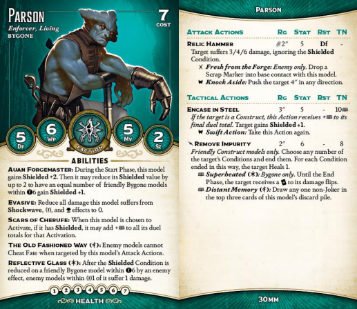 Parson is the lynchpin of any good Tiri crew. First of all, Auan Forgemaster is a way to spread around Shielded without spending AP. There are only two models in the crew that can do that, and both are valuable. What you're really taking him for, though, is Remove Impurity. Clearing conditions is key to letting the Matron do her thing - she hates being Stunned especially - but it's the triggers that make the ability insane. Distant Memory is strong enough, since you can time it right to always draw a Severe, but Superheated is absolutely bananas. You stack this on the Matron's built in +twist to damage and she can cheat basically any damage flip she makes - even Hard to Wound enemies or Soulstone users can't put her on a negative (though a model with