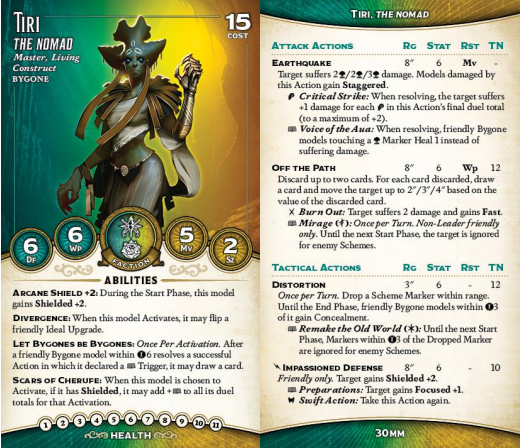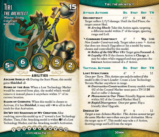 nothing, and turning off all healing for the turn on a single hit is actually quite strong. And she can even build in the trigger to let her do it again; sometimes, it'll just be correct to attack six times with Tiri in one activation. Her bonus, Command Construct, amps up her offensive power, as there are plenty of extremely swole Constructs that she'd love to send into battle. The Ideal-locked triggers on Command are pretty interesting, too - Relics of the Old War lets you just take whatever attack you command with a Focus, nice and simple, while Loyalty lets you charge out of melee and Interact afterwards if you wish, which is