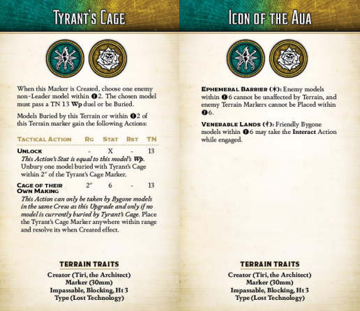Lost Technology markers are the key to understanding Tiri, the Architect. These are special, unique Terrain Marker. There are four of them, three of which have two abilities (one each locked to Tradition and Technology) that function as always-on passive auras.