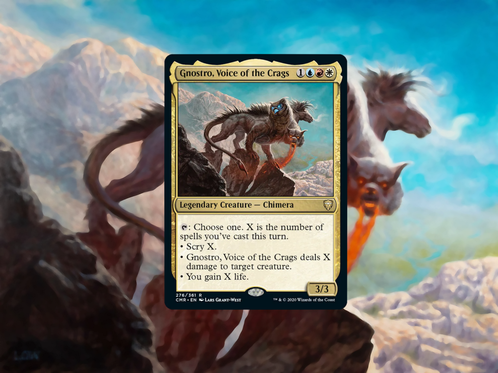 As of August 2025, there is exactly 1 Legendary Chimera, excluding the Changelings in the audience, and we're lucky Gnostro is a fairly competent card. Being in Jeskai colors and releasing in Commander Legends, this card was swept up in the set's hype and forgotten almost instantly, with a scant ~500 decks on EDHREC despite its color identity and profoundly popular plane of origin in Theros. Still, if we're talking about storm payoffs, Gnostro's tap ability is a solid outlet for a turn with plenty of spells, even if it has no direct means of leading to a victory on its own, lacking the ability to target players with its damage. We can use this ability as our guide for the rest of the included Chimeras, and I feel you can make a case for ~9 other Chimeras in a Gnostro list, before your options start drying up.