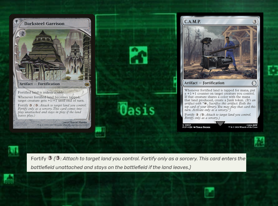 Darksteel Garrison and C.A.M.P., are no slouches. Each of these cards provides some upside when their fortified land is tapped, each growing a creature in some way, and C.A.M.P. giving us a Junk, which is functionally an extra card. Better still, Garrison even protects the land it's attached to, meaning we don't need to worry as much about errant Strip Mines! This is one of those rare decks where it makes a shocking degree of sense to play Fortifications, and that alone is going to draw curious eyes from your opponents.