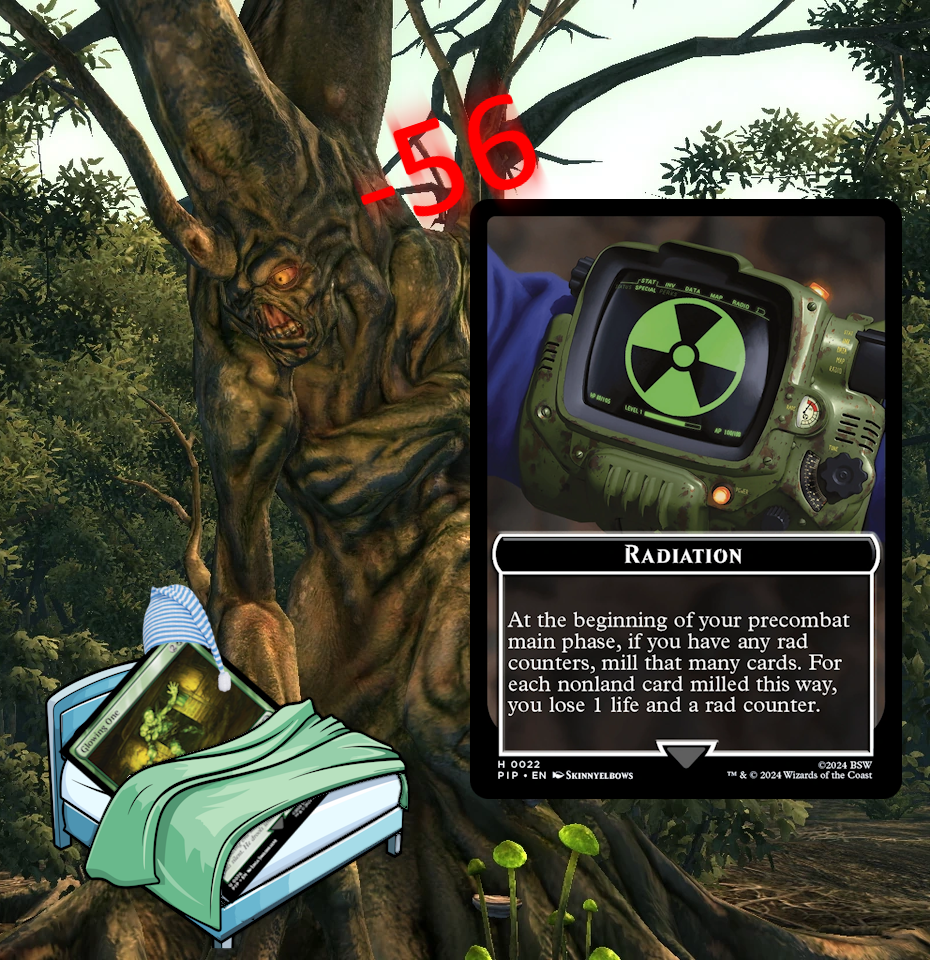Once our commander is dead, however, let's not forget that H&B also gives us the gift of two rad counters. These mill us for a card apiece at the beginning of our precombat main phase, pinging us for each nonland before potentially going away. Notably, regardless of the number of rad counters you have, it's resolved as a single trigger, meaning you can't for example use